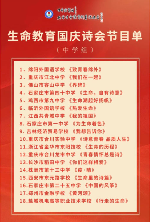花开花落总是诗,生命如诗,可歌可诵。2021年10月9日晚,北京生命教育科普促进会、生命教育网携手36所学校共同举办了生命教育国庆诗会。选手们各显身手,共同创造了一个诗情画意的夜晚,给近20000人留下了美好记忆。