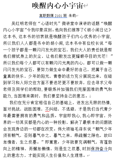 通过组织所有学生观看“心语时光”系列微课视频,撰写观看体会,提高了同学们对心理学知识的学习和运用,提升学生积极心理品质促进我校学生身心健康发展。