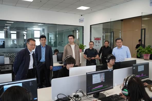 沈剑光一行先后考察了我校低空经济产业学院、工业机器人实训室、数控维修实训室、柔性生产线车间、“数智逐梦”产教融合创新实践基地、“邂逅光影”电影机馆等场所。在参观期间,韩卫红向来宾详细介绍了学校七十余年的发展历程和办学特色,重点阐述了我校在产教融合创新实践、市域产教联合体建设、现代职业教育体系改革及技能比赛等方面取得的显著成果,并展望学校未来发展方向,充分体现了我校“扎根地方、服务发展”的办学定位。