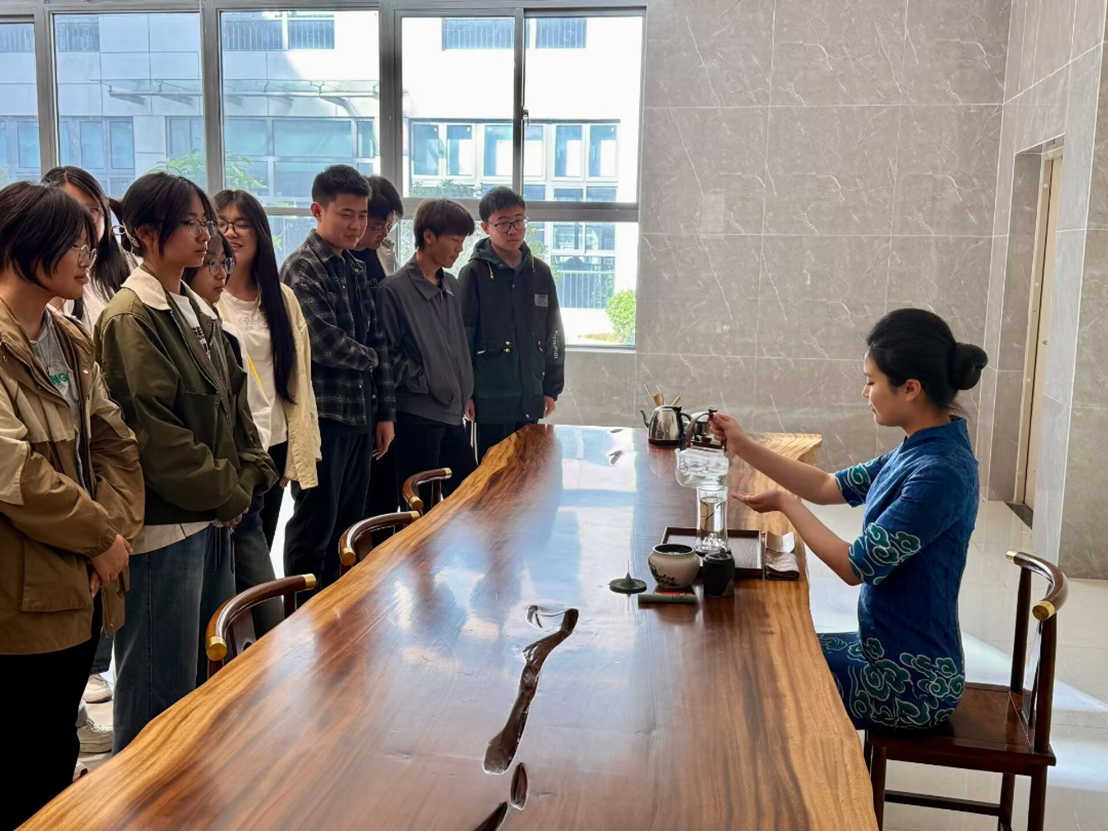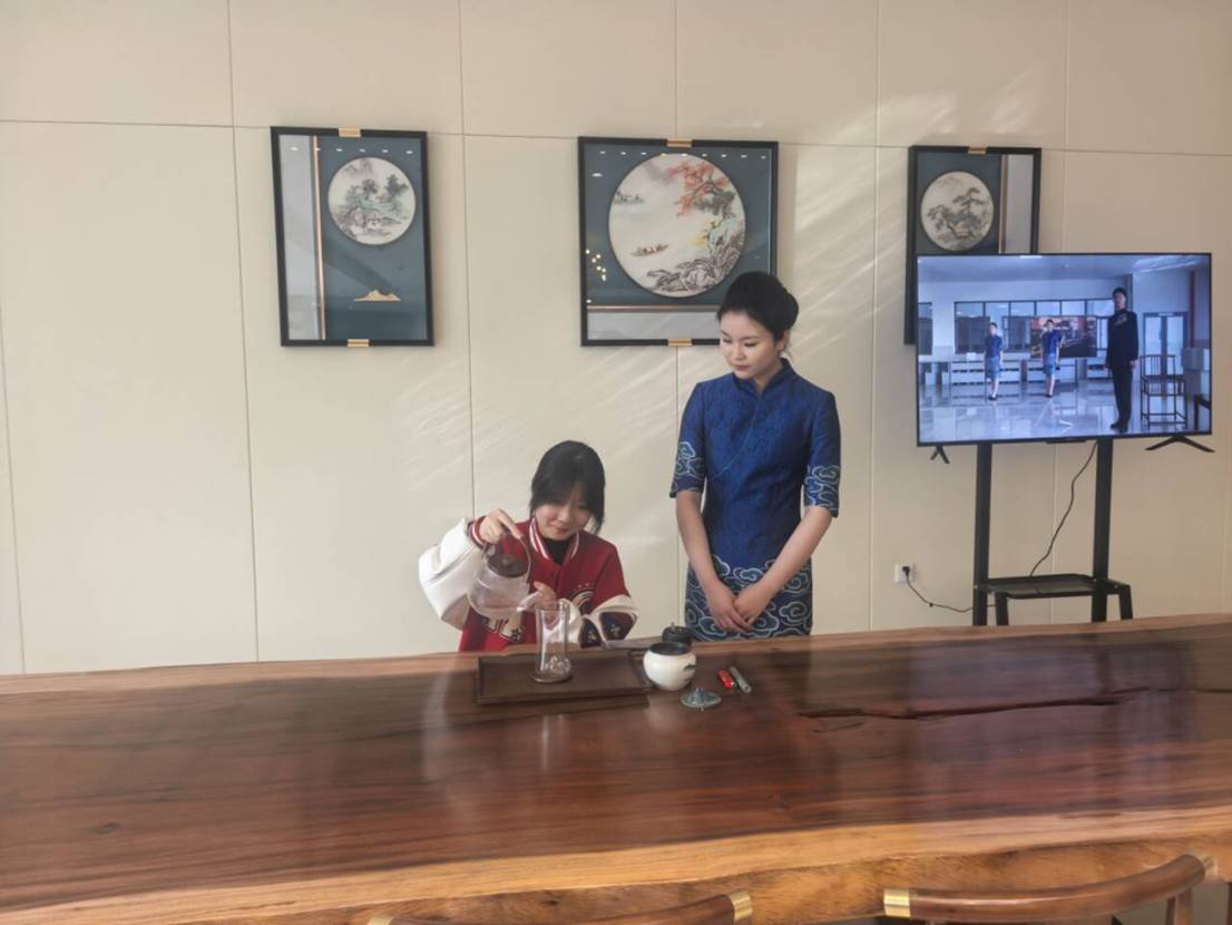 茶艺体验将活动推向了高潮。古色古香的茶席间,茶艺师身着传统服饰,优雅地展示着温杯、投茶、注水、分茶等技艺,举手投足间尽显茶道神韵。同学们不仅学习了冲泡技巧和品茶礼仪,更亲自执壶,为同伴奉上香茗。在氤氲的茶香中,大家静心体味“和、静、雅”的茶道精髓,感悟传统文化中宁静与和谐。