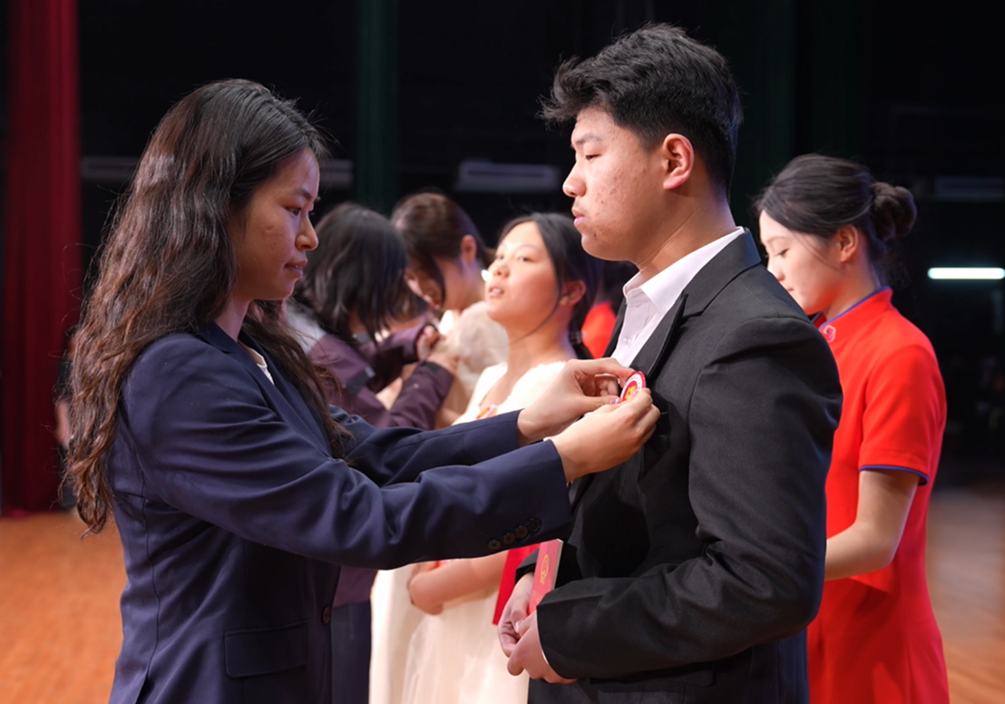 潘良钰为优秀学生代表行庄重的“拨穗礼”,象征着学子们学有所成、迈向人生新阶段。各班班主任依次为班级代表佩戴象征成长与责任的成人勋章,并郑重赠送《中华人民共和国宪法》手册。在领誓人的带领下,全体学生肃立面向国旗,以饱满的精神状态进行成人宣誓。铿锵有力的誓言响彻会场,既是对宪法赋予权利与义务的郑重承诺,更展现了机电学子踌躇满志、勇担使命的青春风采。