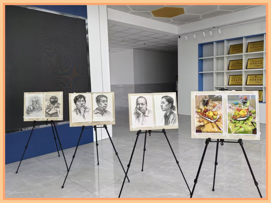 在艺术展区,素描与色彩作品交相辉映,完美诠释了艺术专业学子对美的多元诠释。学生们以静物、头像为临摹对象,运用黑白灰的线条勾勒出物体的空间感和立体感,以细腻的笔触还原了物体的质感与光影,充分彰显了扎实的造型功底。一幅幅充满创意的画作吸引了众多目光,大家纷纷点赞。学生们大胆运用对比色与调和色,通过饱满的色块与灵动的笔触,既展现了专业的色彩构成能力,又传递出对生活的深刻感悟。每一幅作品都是技艺与情感的美妙共鸣,生动诠释了“艺术源于生活又高于生活”的真谛。