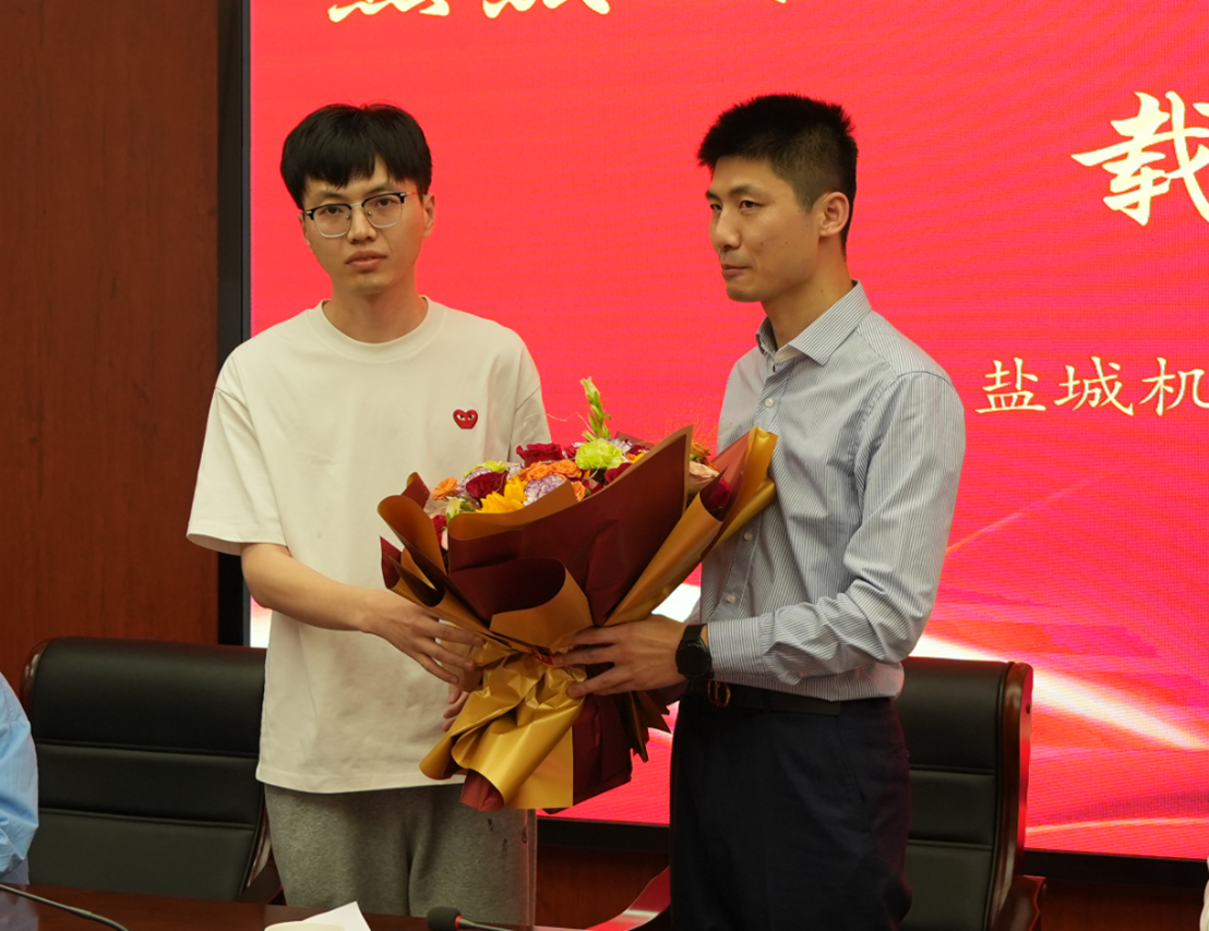 在热烈的掌声中,青年教师代表陈鹏为时鹏老师献上鲜花。陈鹏表示,时老师不仅是技术大师,更是我们职业成长的引路人。这束鲜花承载着全体青年教师的敬意与传承的决心。