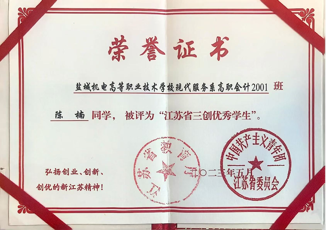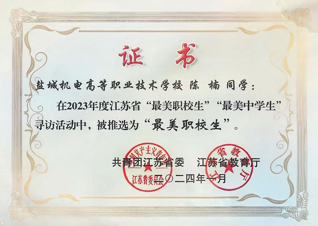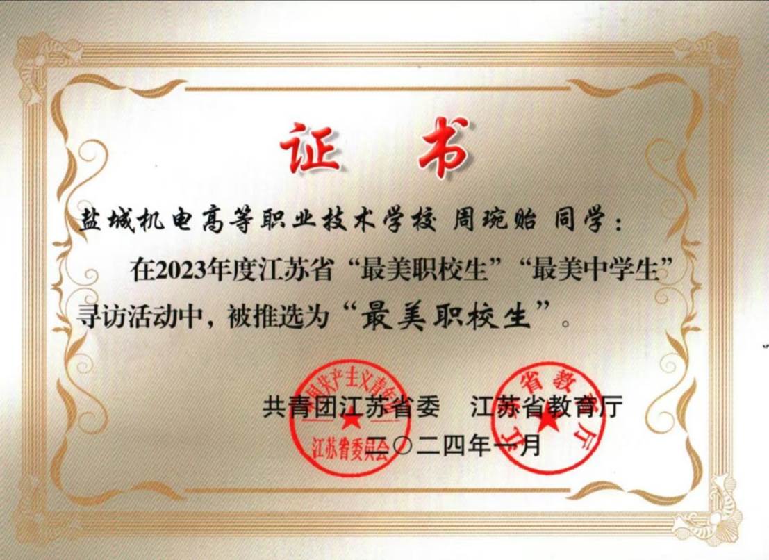 她荣获国家奖学金、获评“江苏省最美职校生”、“江苏省三创优秀学生”等荣誉。