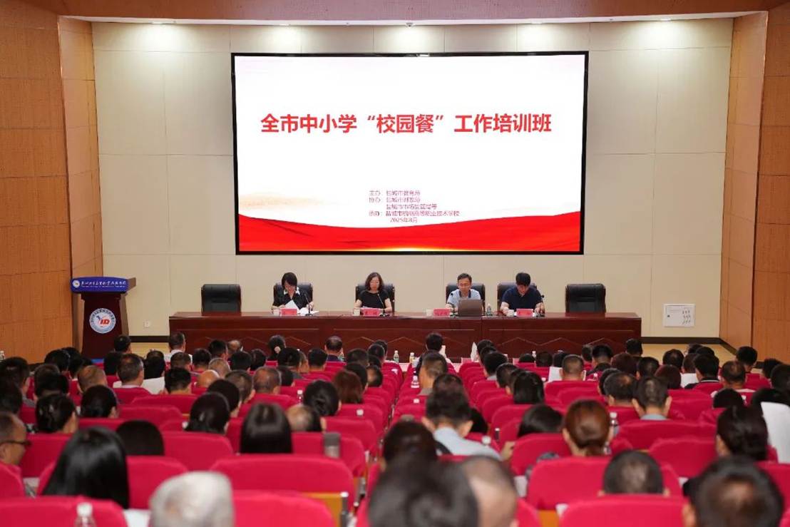 近日,2025 年全市中小学“校园餐”工作培训班在我校顺利举行。市教育局副局长萧媚出席开班仪式并作动员讲话,全市教育系统340余名相关负责同志参加培训。