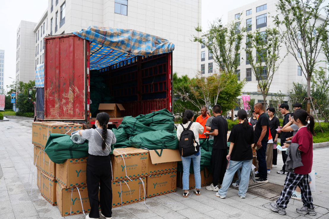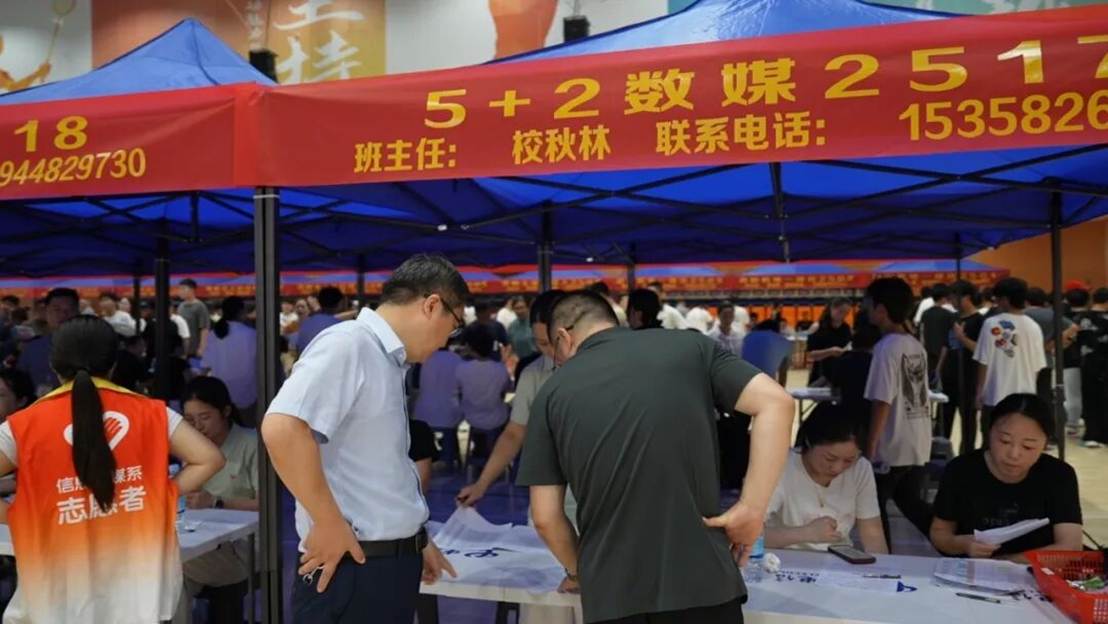 体育馆内,各系迎新点整齐排列、标识清晰。身穿统一文化衫的志愿者活跃在每一处需要帮助的地方——或搬运物资,或指引路线,或解答疑问,动作利落、笑容温暖。他们与手持录取通知书的新同学们交汇互动,形成了一道忙碌而明亮的风景。从签到注册、材料提交,到物品领取,所有流程清晰顺畅、高效有序。热烈而温馨的氛围,给新生和家长们留下了深刻的第一印象。