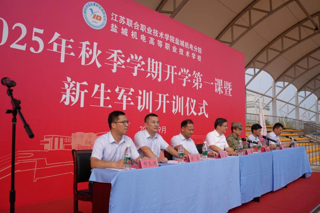 金秋送爽,惠风和畅。9月8日上午,我校在田径场隆重举行2025年秋季学期开学第一课暨新生军训开训仪式。学校党委书记、校长韩卫红,盐城经济技术开发区人武办军训工作负责人胥家震,学校副校长姚波,纪委书记王磊,副校长顾全、祁玉洲,承训教官团队及全体师生共同参加活动。仪式由副校长王著主持。