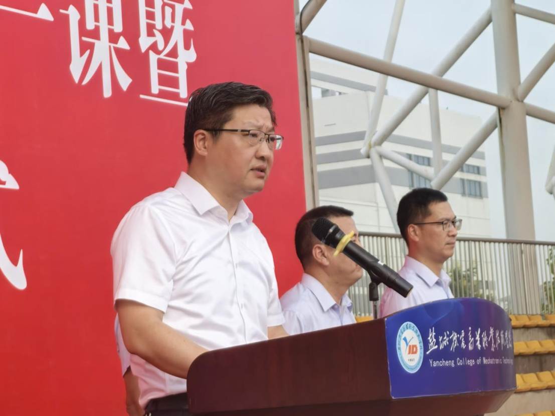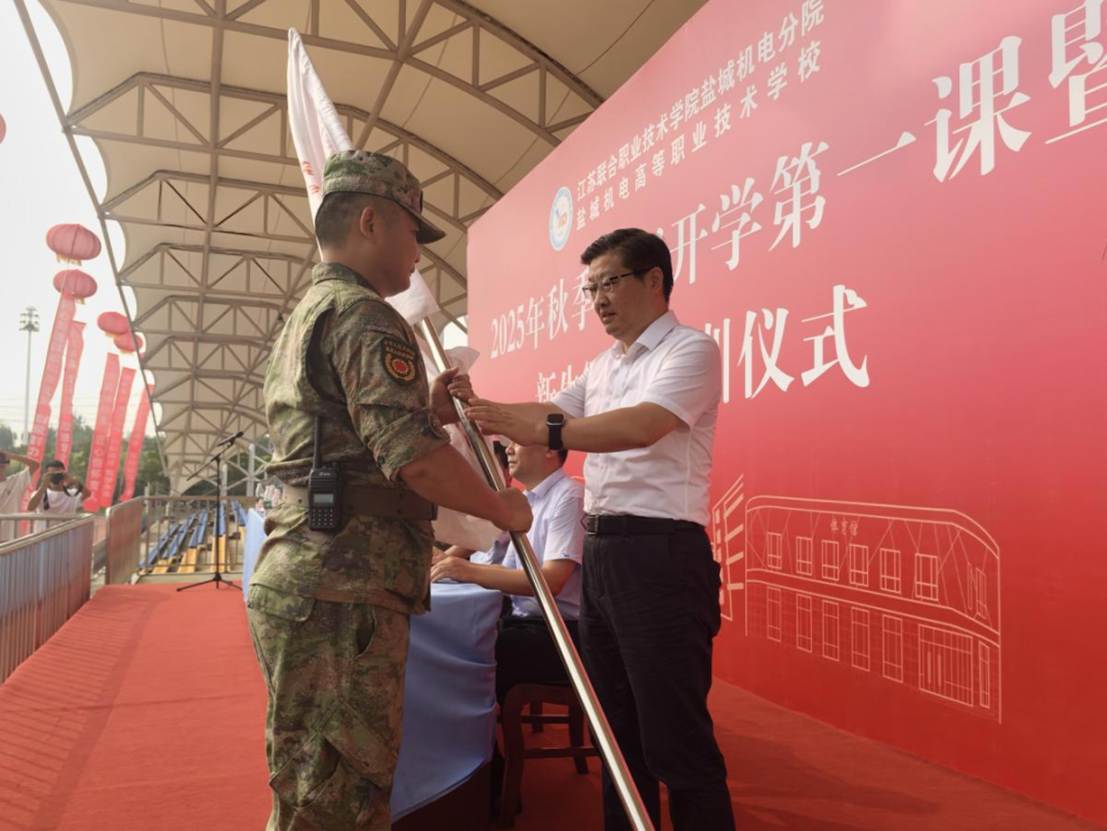 在开学第一课上,韩卫红代表学校向2025级全体新生表示热烈欢迎,并围绕盐城这片红色土地的英雄历史和新四军“铁军精神”的当代意义,为全体师生上了一堂深刻而富有感染力的思想政治课。他寄语全体同学五点期望:第一,勇立“凌云鸿鹄志”,做眼中有光的新时代职教学子;第二,锤炼“卓越工匠魂”,做手中有技的新时代职教学子;第三,永葆“阳光进取心”,做脸上有笑的新时代职教学子;第四,涵养“赤诚报国情”,做心中有爱的新时代职教学子;第五,砥砺“坚韧奋斗行”,做脚下有力的新时代职教学子。