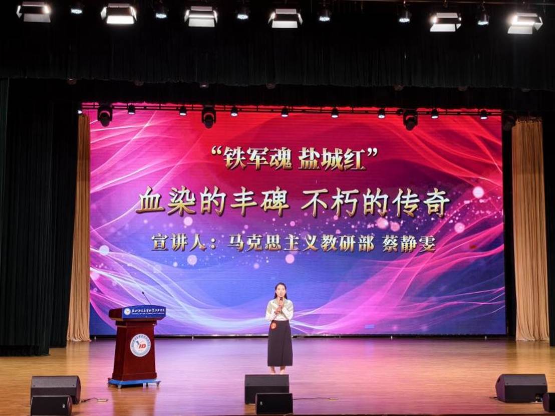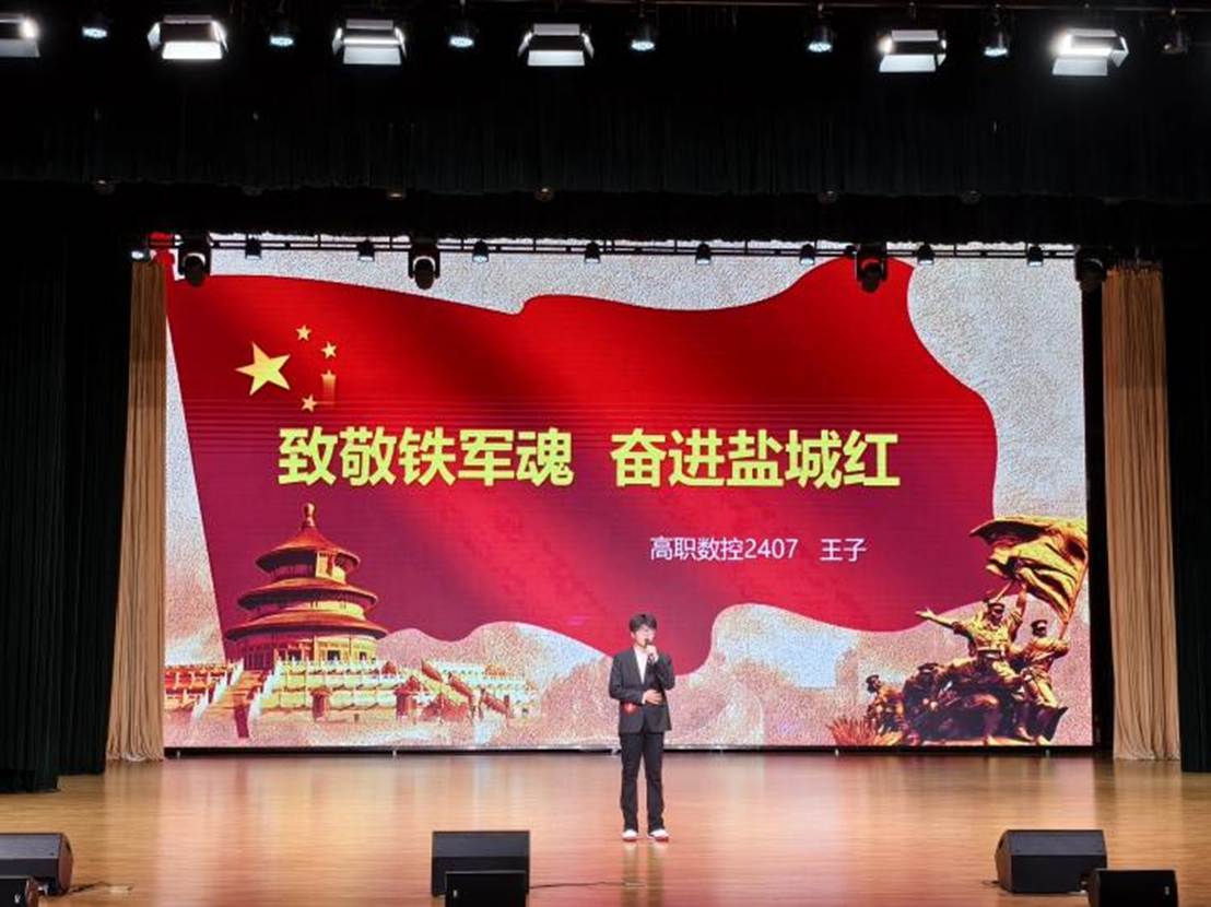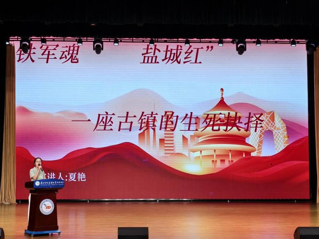 为纪念中国人民抗日战争暨世界反法西斯战争胜利80周年,深入贯彻落实习近平新时代中国特色社会主义思想及习近平总书记在盐城考察时的重要指示精神,9月28日下午,我校隆重举行“铁军魂 盐城红”主题红色故事宣讲大赛决赛。学校纪委书记王磊、副校长顾全、王著,特邀新四军纪念馆讲解员唐静及700余名师生代表共同出席活动。大家齐聚一堂,聆听红色故事,感悟革命精神,接受了一场深刻的思想洗礼。