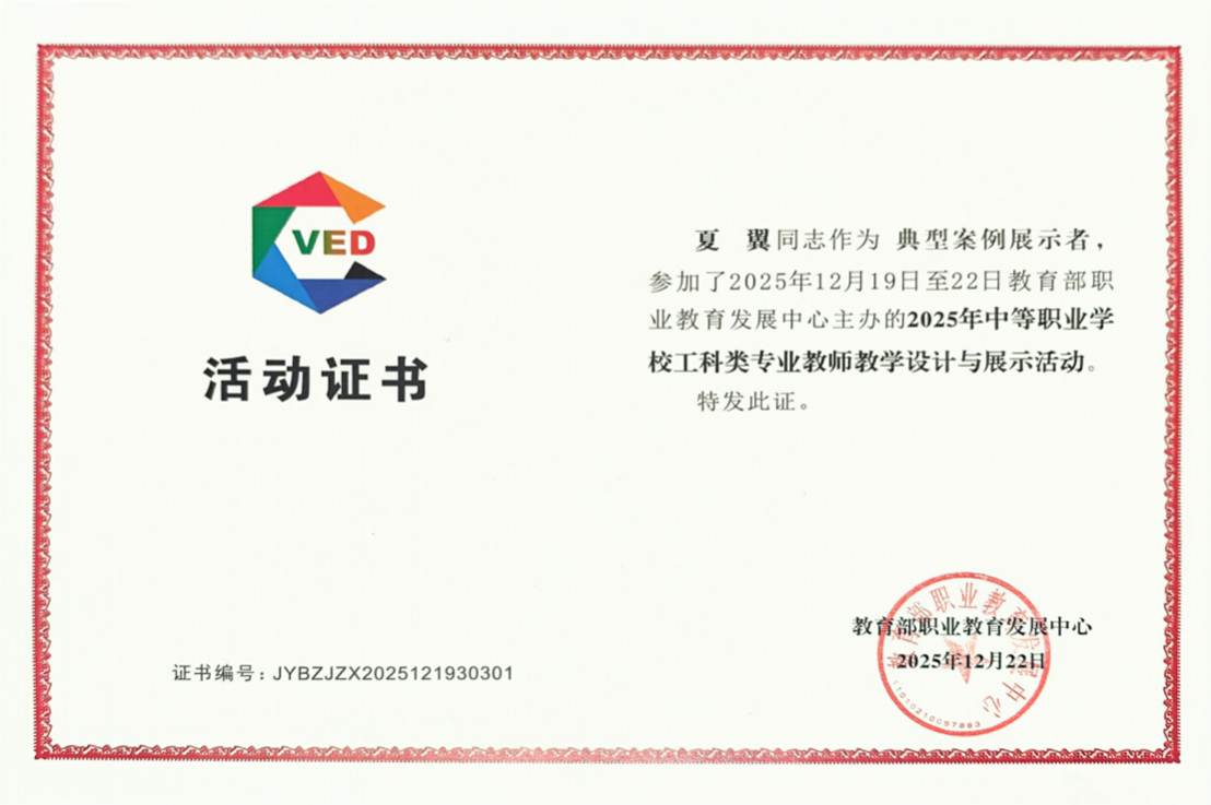 12月19日至22日,由教育部职业教育发展中心主办的2025年中等职业学校工科类专业教师教学设计与展示交流活动在福建福州成功召开。此次活动是教育部职业教育发展中心连续举办的系列交流活动之一,旨在进一步提升教师的教学设计能力,促进职业教育的高质量发展。我校夏翼老师在计算机组全国决赛中脱颖而出,被评为“典型案例展示者”(最高奖项),其作品将由高等教育出版社结集出版并在全国推广。