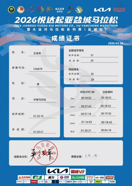 3月29日上午,2026盐城马拉松在万众期待中鸣枪开赛。春风拂面,人潮涌动,赛道之上,激情与梦想交织成一道流动的风景。我校陆上竞技体育社团6名同学勇敢挑战半程马拉松项目,他们以坚定的步伐丈量城市之美,用不懈的坚持回应心中的热爱,最终全员顺利完赛,以昂扬之姿展现了盐城机电学子奋发向上的青春风采。其中,王宝来同学表现尤为亮眼,凭借出色的耐力和稳定的配速,以1小时20分21秒的净成绩斩获半马项目第28名,在众多选手中脱颖而出,为学校争得荣誉。